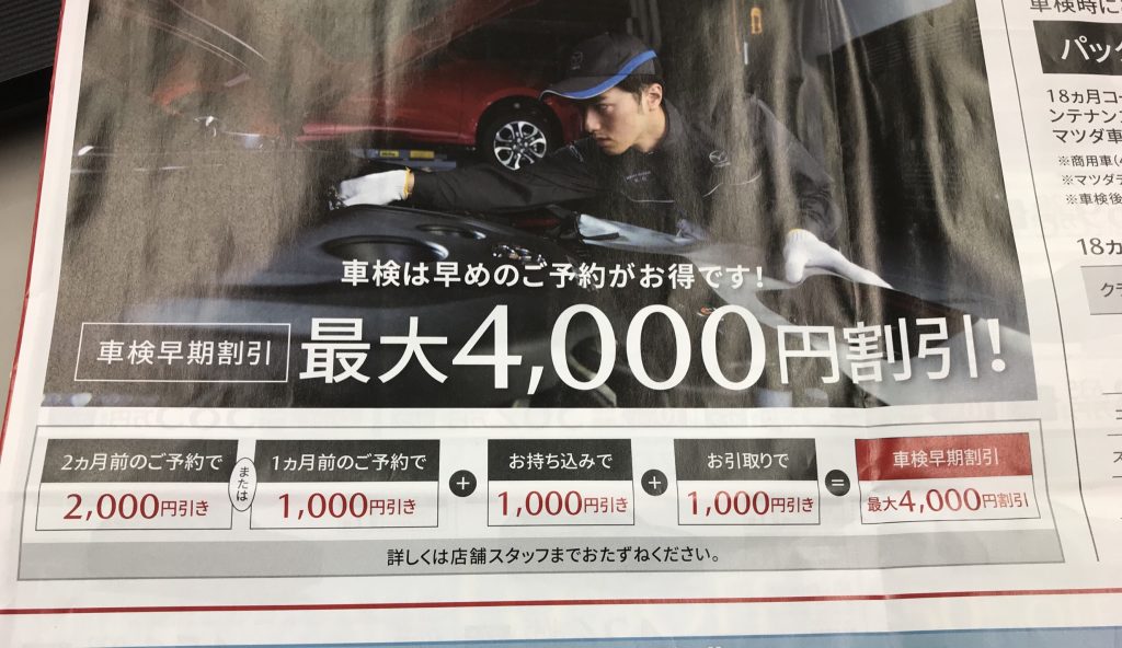 早期予約と持ち込み&引取で割引があるとの事?全然何も言われなかったなと。早期予約と持ち込み&引取りなのに。前回もらった見積もりには記載も無いし説明も無かった。無いのか?、、、、、、ちなみにこのDM車検が届いた日を番号で検索して調べると案内が自宅に届いた時点で既に車検迄1ヶ月しか無く2ヶ月前予約が使えない状態でした。
