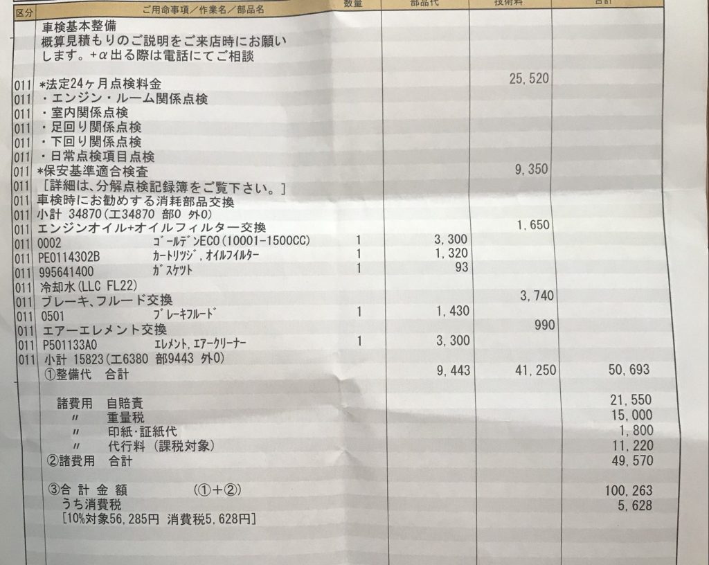 そんなわけでディーラーに行ってきましたが、そこで見積もりをしてもらい確認してみると車検整備の費用がガッツリ含まれています。